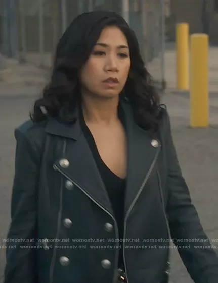 Melody Bayani (played by Liza Lapira) on The Equalizer on CBS was spotted wearing this blue leather jacket with silver buttons on The Equalizer on episode 'Separated' (2x08) in Jan 2022. Mel's Jacket is the Billie Leather Moto Jacket in Midnight by L'Agence.