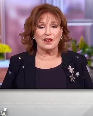 Joy Behar on The View on ABC was spotted wearing this black star and moon embellished blazer on The View on Feb 03 2022's episode. Joy's Blazer is the Hearts and Stars Embroidered Embellished Blazer by Cinq a Sept.