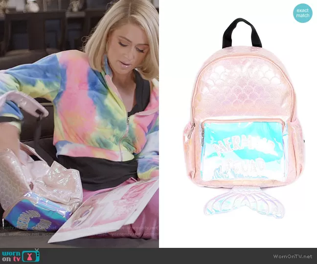 Paris Hilton on Paris in Love on Peacock was spotted wearing this metallic mermaid backback on Paris in Love on episode 'Past Imperfect' (1x08) in Jan 2022. Paris's Backpack is the Holographic Mermaid Squad Backback by 3am.