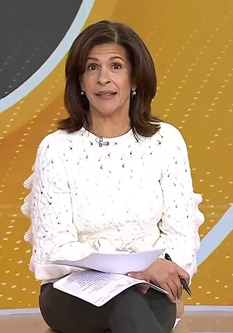 Hoda Kotb on Today on NBC was spotted wearing this white cable knit ruffle sweater on Today on Jan 03 2022's episode. Hoda's Sweater is the Cascading Ruffle-Trim Sweater by Carolina Herrera.