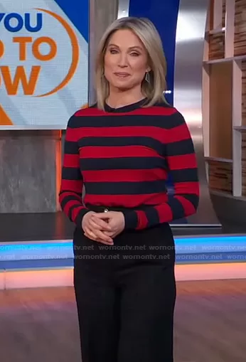 Amy Robach on Good Morning America on ABC was spotted wearing this red striped top and tweed pants on Good Morning America on Jan 04 2022's episode. Amy's Sweater is the Felicia Stripe Print Wool Sweater by Boss . Amy's Pants is the All I Tweed Pant by Guess.