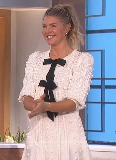 Amanda Kloots on The Talk on CBS was spotted wearing this white bow mini sweater dress on The Talk on Jan 04 2022's episode. Amanda's Dress is the Kitty Bow Front Sweater Dress by Alice + Olivia . Amanda's Shoes is the Monogram Fringe Detail Pumps by Gucci.