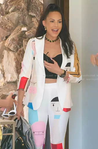 Amanza Smith on Selling Sunset on Netflix was spotted wearing this white doll print blazer and pants on Selling Sunset on episode 'Back on the Market' (4x07) in Nov 2021. Amanza's Jacket is the Salvador No-Closure Doll-Print Silk Crepe Jacket by Akris . Amanza's Pants is the Chris Doll-Print High-Waist Cuffed Crepe Pants by Akris.