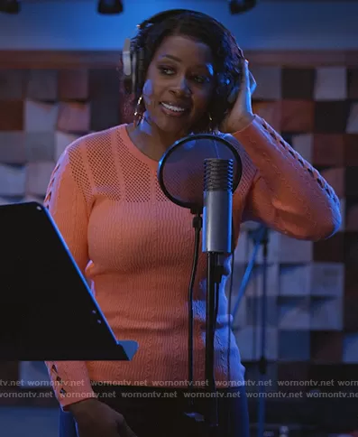 (played by ) on Queens on ABC was spotted wearing this orange mesh top on Queens on episode 'Bars' (1x09) in Jan 2022. 's Sweater is the Mesh Sweater by Kenzo.