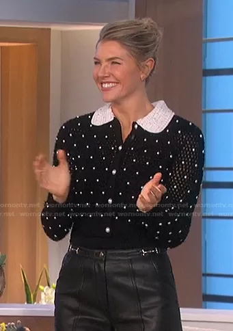 Amanda Kloots on The Talk on CBS was spotted wearing this black pearl embellished cardigan and horsebit leather shorts on The Talk on Jan 05 2022's episode. Amanda's Sweater is the Collins Imitation Pearl Crochet Wool Cardigan by Alice + Olivia . Amanda's Shorts is the Horsebit Detail Leather Shorts by Maje.