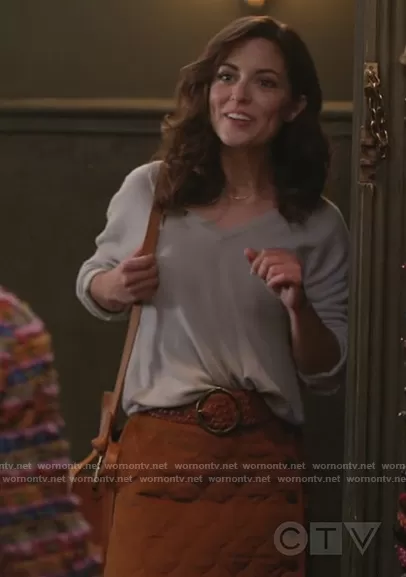 (played by ) on Home Economics on ABC was spotted wearing this quilted skirt on Home Economics on episode 'Men's Water-Resistant Watch' (2x10) in Jan 2022. 's Skirt is the Curvy Corduroy Quilted Mini Skirt by Madewell.