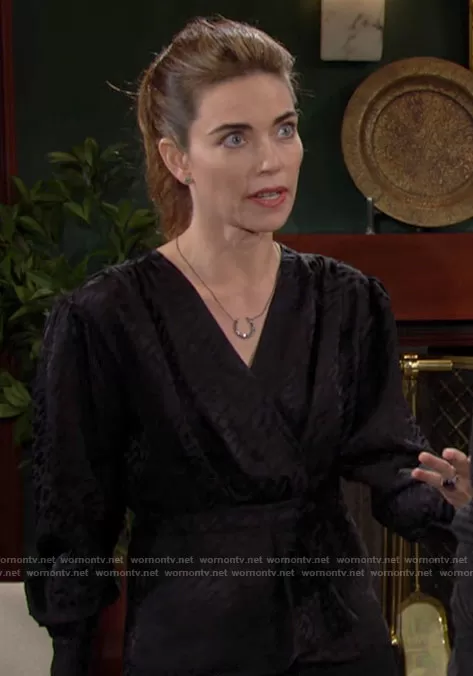 Victoria Newman (played by Amelia Heinle) on The Young and the Restless on CBS was spotted wearing this black leopard print blouse on The Young and the Restless on Jan 06 2022's episode. Victoria's Top is the Jacquard Draped Leopard Print Top by The Kooples.
