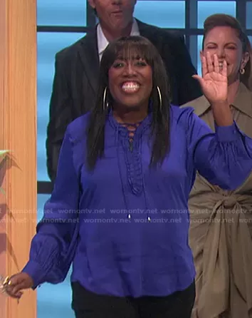 Sheryl Underwood on The Talk on CBS was spotted wearing this blue ruffled lace-up blouse on The Talk on Jan 06 2022's episode. Sheryl's Top is the Sandwashed Satin Ruffle Blouse by Chico's.