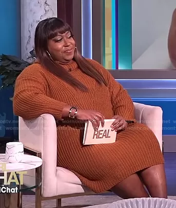 Loni Love on The Real on BETher was spotted wearing this brown ribbed sweater dress on The Real on Jan 06 2022's episode. Loni's Dress is the Funnel Neck Sweater Dress by Eloquii.