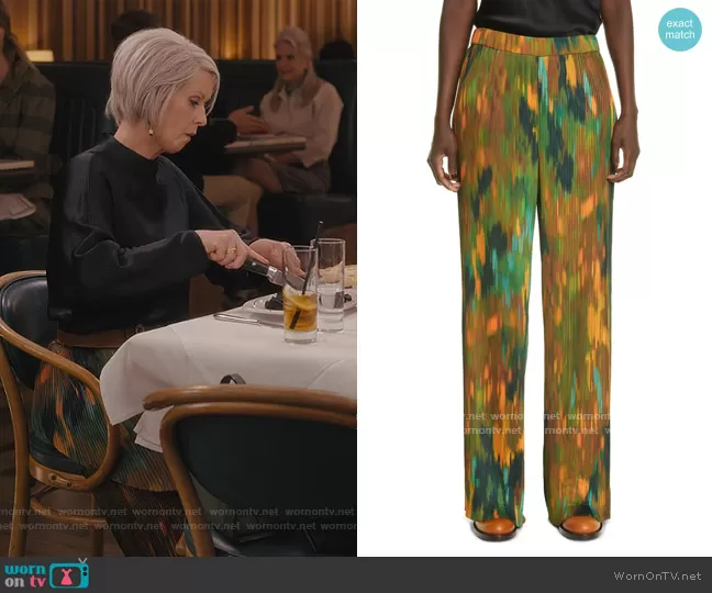 Miranda Hobbs (played by Cynthia Nixon) on And Just Like That on HBO was spotted wearing this abstract print pleated pants on And Just Like That on episode 'Diwali' (1x06) in Jan 2022. Miranda's Pants is the Riverside Reverie Print KindMade Pleated Pants by Lafayette 148 New York.