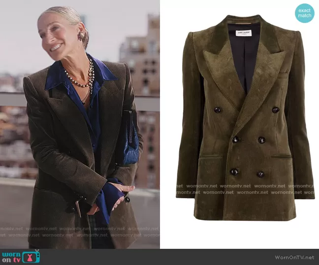 Carrie Bradshaw (played by Sarah Jessica Parker) on And Just Like That on HBO was spotted wearing this green corduroy blazer on And Just Like That on episode 'Diwali' (1x06) in Jan 2022. Carrie's Blazer is the Corduroy Double-Breasted Blazer.