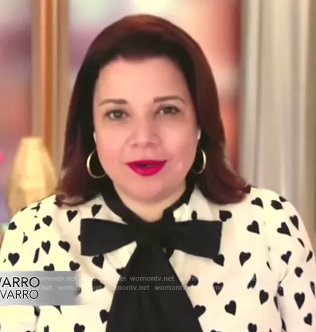 Ana Navarro on The View on ABC was spotted wearing this white heart print tie neck blouse on The View on Jan 07 2022's episode. Ana's Top is the Tie Neck Blouse by Eloquii.
