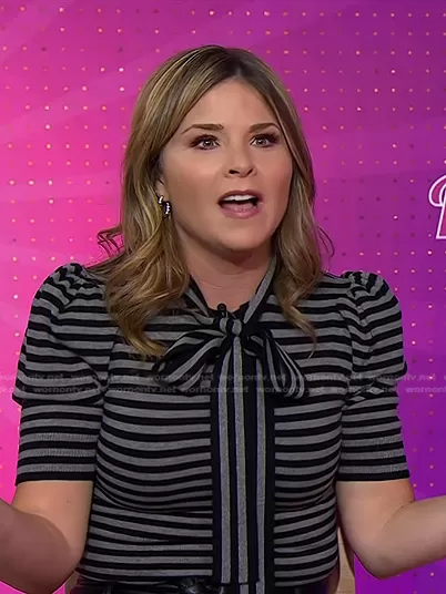Jenna Bush Hager on Today on NBC was spotted wearing this grey striped tie neck top on Today on Aug 23 2022's episode. Jenna's Top is the Tie Neck Stripe Cashmere Sweater by Michael Kors.