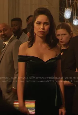 (played by ) on Nancy Drew on The CW was spotted wearing this green off-shoulder velvet dress on Nancy Drew on episode 'The Confession of the Long Night' (3x10) in Jan 2022. 's Dress is the Willa Off the Shoulder Velvet Dress by Chiara Boni La Petite Robe.