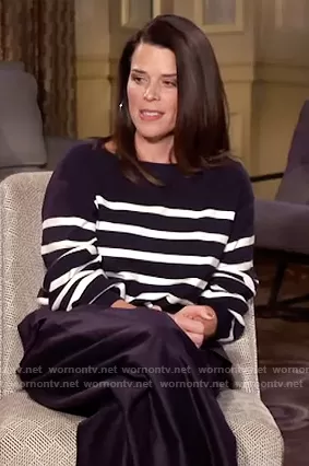 on The Drew Barrymore Show on CBS was spotted wearing this navy stripe sweater on The Drew Barrymore Show on Jan 10 2022's episode.