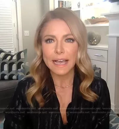 Kelly Ripa on Live with Kelly and Mark on Disney ABC Home Entertainment was spotted wearing this metallic stripe blouse on Live with Kelly and Ryan on Jan 10 2022's episode. Kelly's Top is the Tie-neck striped metallic silk-blend shirt by Saint Laurent.