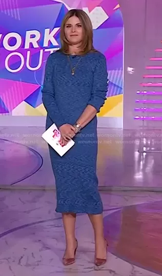 Jenna Bush Hager on Today on NBC was spotted wearing this blue ribbed knit midi dress on Today on Jan 11 2022's episode. Jenna's Dress is the Printed Combed Cotton Midi Dress by Tibi.