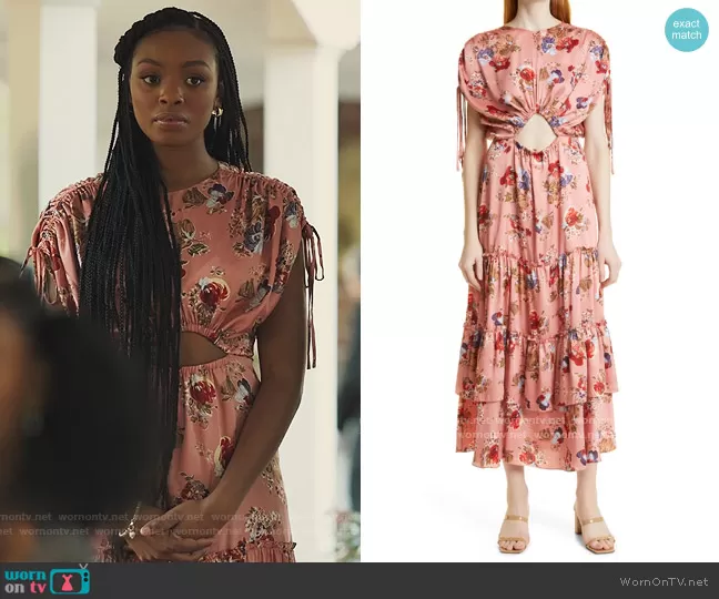 Nikki Vaughn (played by Alana Bright) on Our Kind of People on FOX was spotted wearing this pink floral ruched dress on Our Kind of People on episode 'Just Desserts' (1x10) in Jan 2022. Nikki's Dress is the Martine Cutout Short Sleeve Tiered Dress by Cinq a Sept.