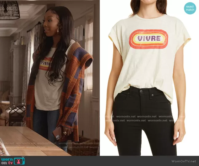 Naomi (played by Brandy Norwood) on Queens on ABC was spotted wearing this white Vivre graphic tee on Queens on episode 'Nasty Girl Records' (1x10) in Jan 2022. Naomi's Top is the Rooky Graphic Tee by Ba&sh.