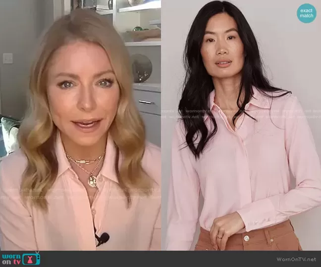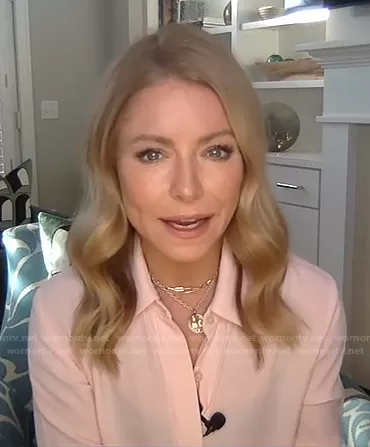 Kelly Ripa on Live with Kelly and Mark on Disney ABC Home Entertainment was spotted wearing this pink button up blouse on Live with Kelly and Ryan on Jan 12 2022's episode. Kelly's Top is the The Simone Blouse by Numi.