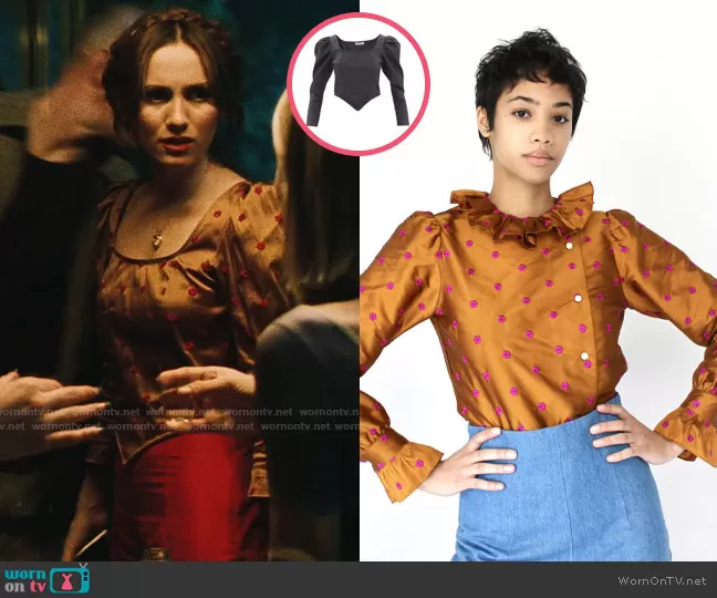 Lexi Howard (played by Maude Apatow) on Euphoria on HBO was spotted wearing this bronze flower embroidered top and pink pants on Euphoria on episode 'Trying to Get to Heaven Before They Close the Door' (2x01) in Jan 2022. Lexi's Top is the Custom made square neck top in tumeric by Batsheva . Lexi's Pants is the Custom made ruffle hem pants by Batsheva . Lexi's Necklace is the Engraved Puff Heart Locket by The M Jewelers .