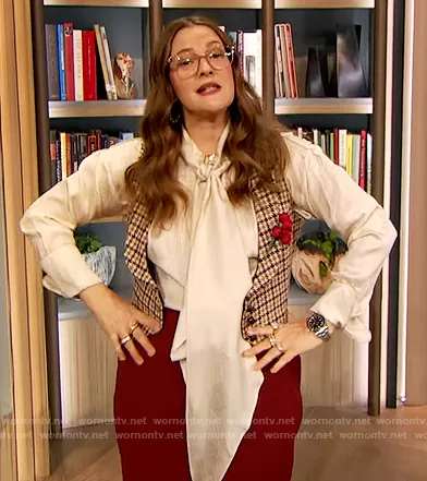Drew Barrymore on The Drew Barrymore Show on CBS was spotted wearing this white satin tie neck blouse on The Drew Barrymore Show on Jan 12 2022's episode. Drew's Top is the Moviso Blouse by Max Mara . Drew's Pants is the Vesta flared wool-blend hopsack trousers by Gabriela Hearst.