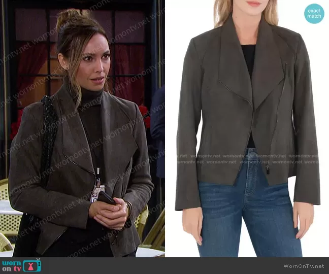 Gwen Rizczech (played by Emily O'Brien) on Days of our Lives on Peacock was spotted wearing this grey draped suede jacket on Days of our Lives on Jan 05 2023's episode. Gwen's Jacket is the Carina Faux Suede Drape Moto Jacket by Kut from the Kloth.