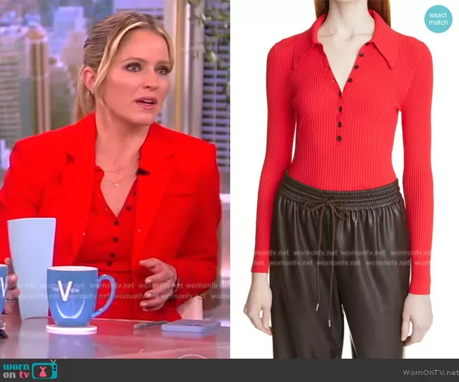 Sara Haines on The View on ABC was spotted wearing this red ribbed polo on The View on Jun 20 2023's episode. Sara's Top is the Lance Ribbed Top by A.L.C..