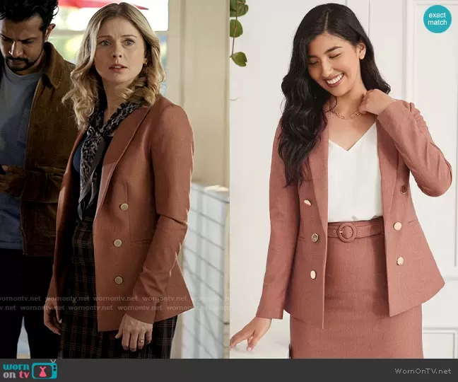 Sam (played by Rose McIver) on Ghosts on CBS was spotted wearing this pink blazer and plaid double-breasted skirt on Ghosts on episode 'Sam's Mom' (1x11) in Jan 2022. Sam's Jacket is the Birdseye Faux Double-Breasted Blazer by Rw&Co . Sam's Skirt is the Plaid Double-Breasted Mini Skirt by Madewell.