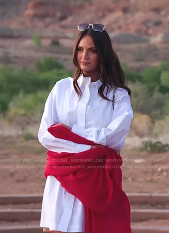 Lisa Barlow on The Real Housewives of Salt Lake City on Bravo was spotted wearing this white poplin shirtdress on The Real Housewives of Salt Lake City on episode 'Who’s Calling Who A Fraud?' (2x17) in Jan 2022. Lisa's Dress is the Zena Mini Shirt-Dress by Loulou Studio . Lisa's Sunglasses is the SMU 70U Sunglasses in Silver/Grey by Miu Miu.