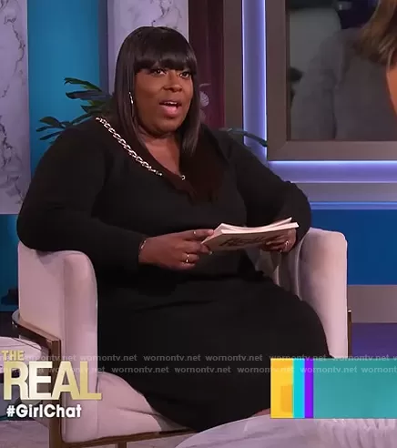 Loni Love on The Real on BETher was spotted wearing this black chain embellished sweater dress on The Real on Jan 17 2022's episode. Loni's Dress is the Chain Scoop Sweater Dress by Eloquii.