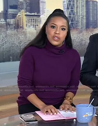 Sheinelle Jones on Today on NBC was spotted wearing this purple turtleneck sweater on Today on Jan 18 2022's episode.