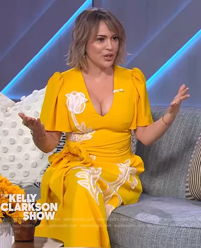 on The Kelly Clarkson Show on NBC was spotted wearing this yellow floral embroidered dress on The Kelly Clarkson Show on Jan 18 2022's episode. 's Dress is the Floral Embroidered Fluid Dress by Lela Rose.
