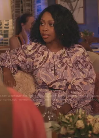 (played by ) on Black-ish on ABC was spotted wearing this lilac printed long sleeve dress on Black-ish on episode 'Bow-Mo' (8x03) in Jan 2022. 's Dress is the Rosanna Dress by A.L.C..