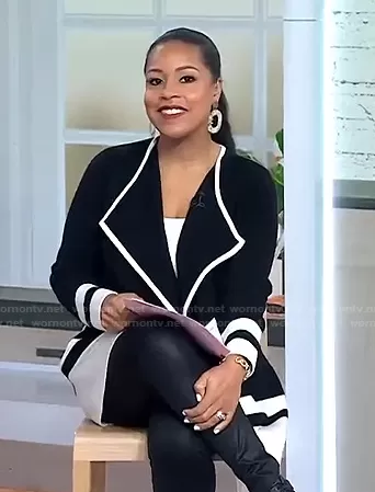 Sheinelle Jones on Today on NBC was spotted wearing this black contrast trim draped jacket on Today on Mar 30 2022's episode. Sheinelle's Jacket is the Drape Front Open Sweater Jacket by Talbots.