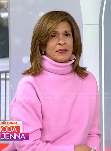 Hoda Kotb on Today on NBC was spotted wearing this pink turtleneck sweater on Today on Jan 19 2022's episode. Hoda's Sweater is the Oversized Knit Turtleneck Sweater by Zara.