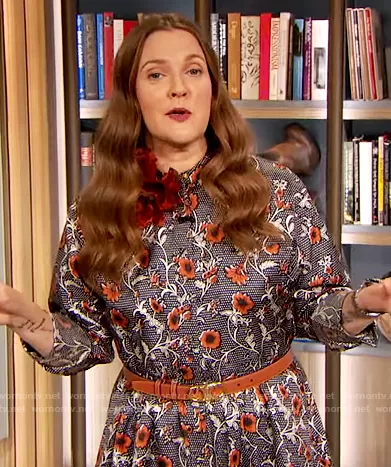 Drew Barrymore on The Drew Barrymore Show on CBS was spotted wearing this floral print shirtdress on The Drew Barrymore Show on Jan 19 2022's episode. Drew's Dress is the Eleanor Silk Floral Shirtdress by Tory Burch . Drew's Belt is the Small Maillion Triomphe Belt by Celine.