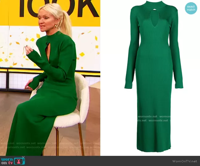 Drew Barrymore on The Drew Barrymore Show on CBS was spotted wearing this Zanna Roberts green cutout ribbed dress on The Drew Barrymore Show on Jan 19 2022's episode. Drew's Dress is the Ribbed Knit Keyhole Maxi Dress by Monse.