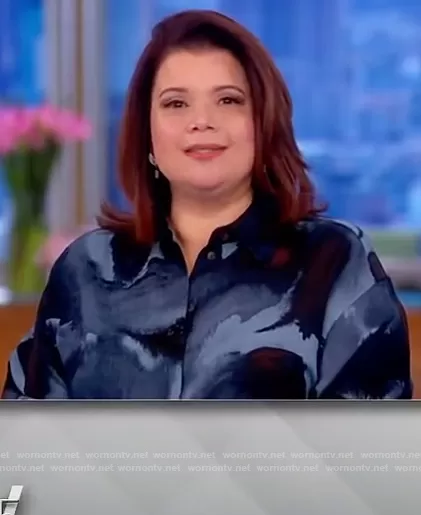Ana Navarro on The View on ABC was spotted wearing this blue printed blouse on The View on Jan 19 2022's episode. Ana's Top is the Scottie Ink Drop Blouse by Lafayette 148.