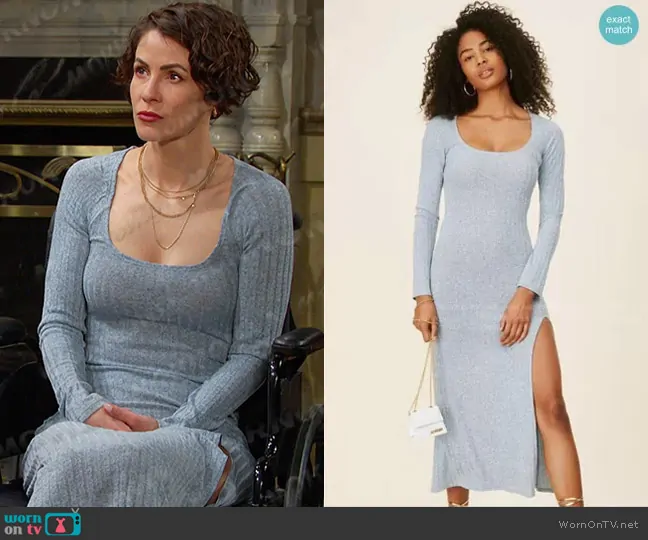 Sarah Horton (played by Linsey Godfrey) on Days of our Lives on Peacock was spotted wearing this blue ribbed scoop neck dress on Days of our Lives on Nov 08 2024's episode. Sarah's Dress is the Lemon Dress by Reformation.