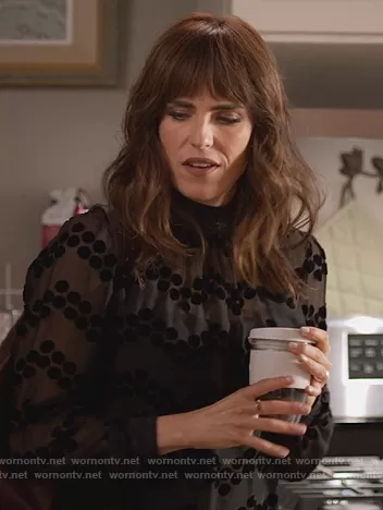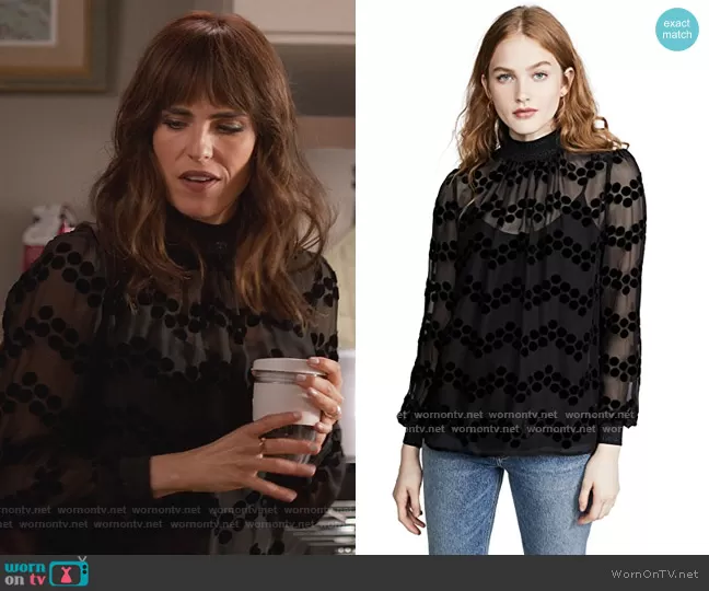 Marina (played by Karla Souza) on Home Economics on ABC was spotted wearing this black sheer dotted blouse on Home Economics on episode 'Round Trip Ticket SAN-OAK' (2x12) in Jan 2022. Marina's Top is the Velvet Devore Dot Embroidered Top by Tory Burch.
