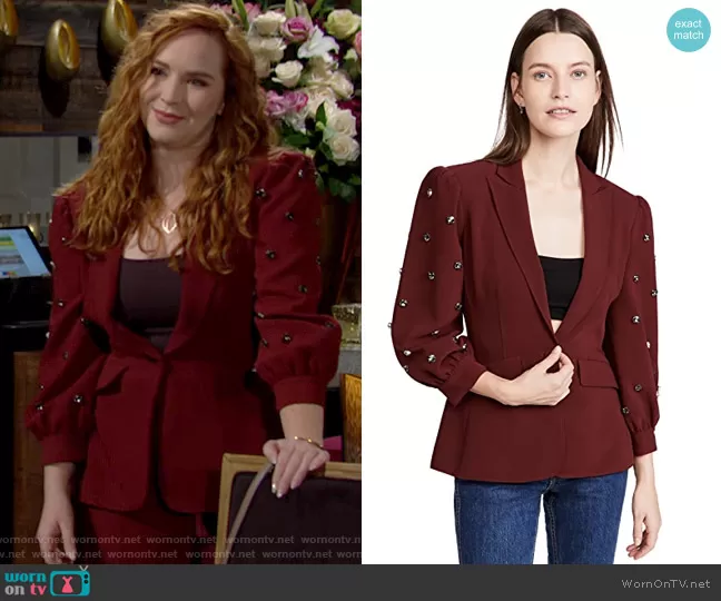 Mariah Copeland (played by Camryn Grimes) on The Young and the Restless on CBS was spotted wearing this burgundy blazer with studded sleeves on The Young and the Restless on Jan 20 2022's episode. Mariah's Jacket is the Jeweled Amie Blazer in Sangria by Cinq a Sept.