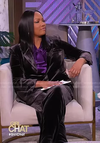 Garcelle Beauvais on The Real on BETher was spotted wearing this purple blouse and velvet blazer on The Real on Jan 20 2022's episode. Garcelle's Top is the Concise Silk Bow Tie Blouse by Lily Silk . Garcelle's Jacket is the Silk Blend Velvet Blazer by Zara . Garcelle's Pants is the Silk Blend Velvet Pants by Zara.