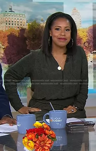 Sheinelle Jones on Today on NBC was spotted wearing this green dotted mini dress on Today on Oct 05 2023's episode. Sheinelle's Dress is the Jasmine Tiered Mini Dress by Rails.