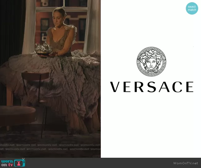 Carrie Bradshaw (played by Sarah Jessica Parker) on And Just Like That on HBO was spotted wearing this blue ruffled gown on And Just Like That on episode 'Bewitched, Bothered, and Bewildered' (1x08) in Jan 2022. Carrie's Dress is the Vintage Dress by Versace.