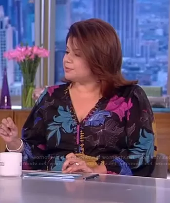 Ana Navarro on The View on ABC was spotted wearing this black floral v-neck dress on The View on Jan 20 2022's episode. Ana's Dress is the Alexi Floral Midi-Dress by Kobi Halperin.