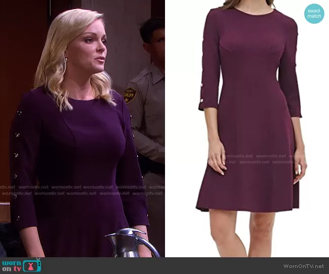 Belle Brady (played by Martha Madison) on Days of our Lives on Peacock was spotted wearing this purple button-sleeve dress on Days of our Lives on Jan 21 2022's episode. Belle's Dress is the Fit and Flare Button Sleeve Dress by Tommy Hilfiger.