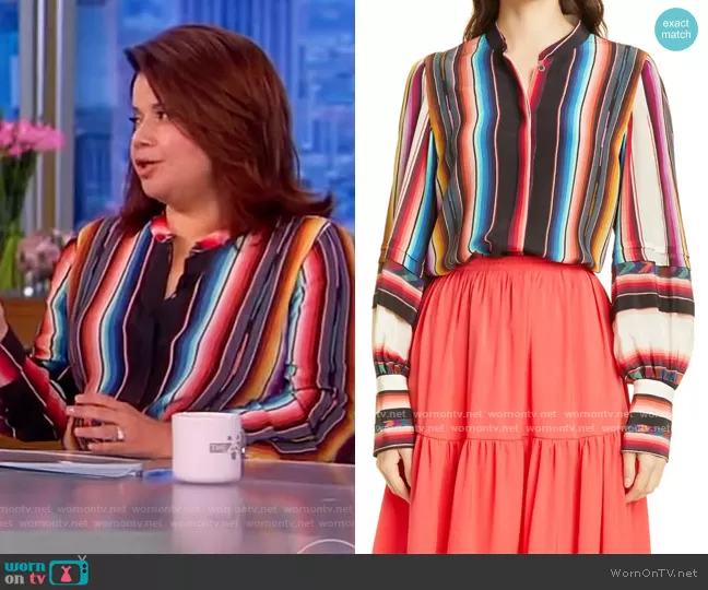 Ana Navarro on The View on ABC was spotted wearing this multicolored stripe blouse on The View on Jan 21 2022's episode. Ana's Top is the Felina Stripe Blouse by Kobi Halperin.