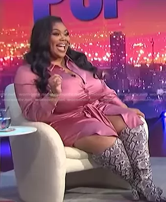 Nina Parker on E! News on E! was spotted wearing this pink tie waist satin shirtdress on E! News Nightly Pop on Apr 22 2022's episode. Nina's Dress is the Trendy Plus Size Satin Tie-Front Shirtdress in Heather Rose by Nina Parker.