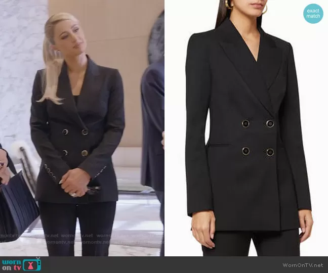 Paris Hilton on Paris in Love on Peacock was spotted wearing this black double breasted blazer on Paris in Love on episode 'Ms. Hilton Goes to Washington' (1x11) in Jan 2022. Paris's Blazer is the Rossini double breasted blazer by Rebecca Vallance . Paris's Pants is the Amina High Rise Flared Pants by Rebecca Vallance . Paris's Sunglasses is the Medusa Icon Cat eye Frame Sunglasses by Versace . Paris's Bag is the Bow Embellished Bag by Saint Laurent.